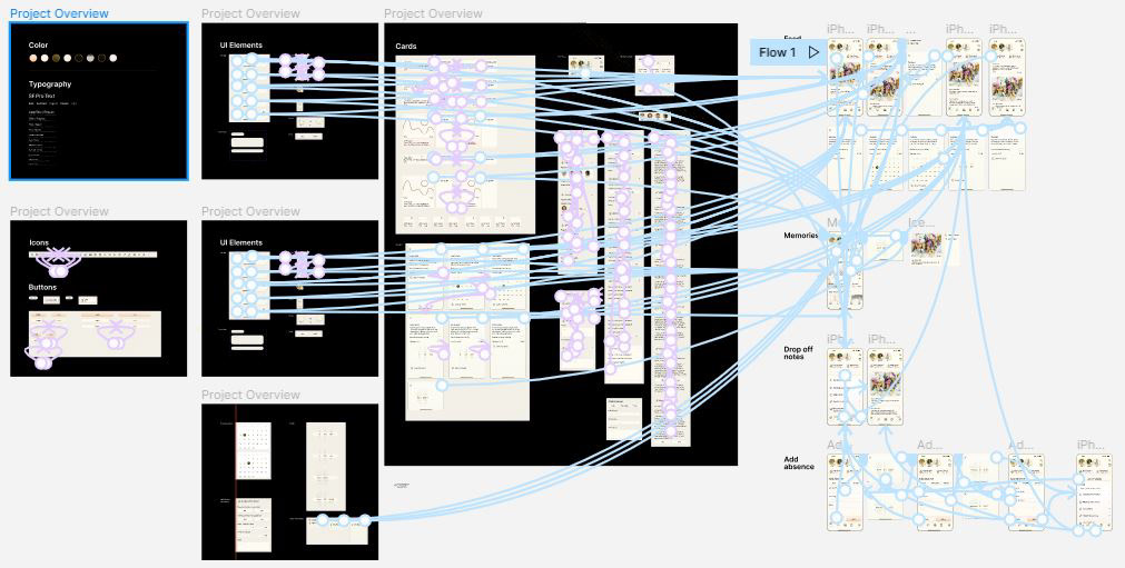 The User flow connects the Home screen, Memories, Drop off Notes and Add Absence screens. Users can expand or collapse Drop-off information, swipe left to open to reveal additional functions and view photos and posts in full size.